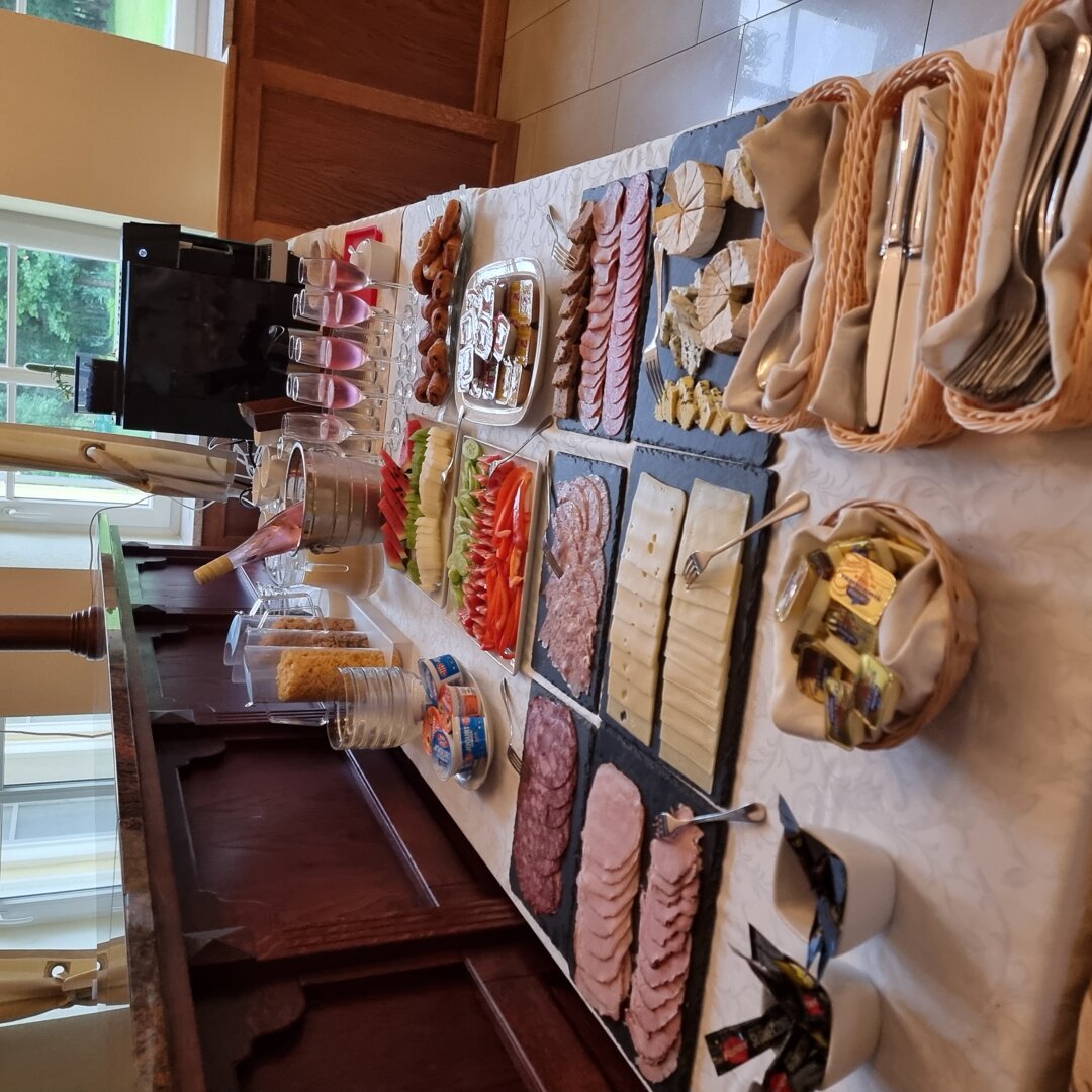 Serwujemy kontynentalne śniadanie (continental breakfast) w wersji rozszerzonej z bogatym wyborem wędlin, serów, warzyw, owoców, dżemu, płatków śniadaniowych, jogurtów, oprócz tego serwujemy ciepłe dania – jajecznicę, kiełbaski lub boczku.